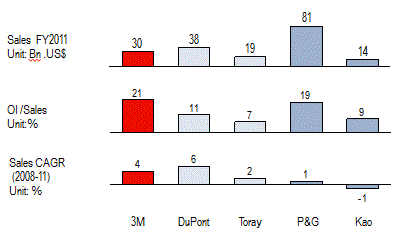 下の図はやや古いが、3Mと工業系素材メーカーの代表であるDuPontと東レ、消費財系素材メーカーの一面を持つP&Gと花王との業績比較。